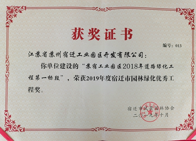 蘇宿工業(yè)園區(qū)2018年道路綠化工程榮獲“2019年度宿遷市園林綠化優(yōu)秀工程獎(jiǎng)”稱號(hào)