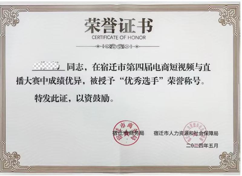 榮譽(yù)證書(shū)得獲得不僅是對(duì)參賽選手個(gè)人努力和才華的認(rèn)可,也是對(duì)蘇宿電商園在電商領(lǐng)域?qū)I(yè)人才培養(yǎng)和推動(dòng)電商直播行業(yè)發(fā)展的成果的肯定。
