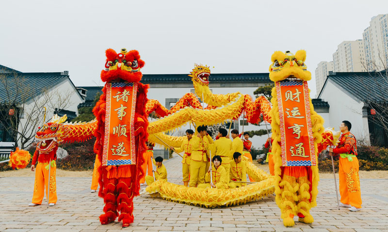 隨著激昂的鑼鼓聲響起,兩條金色巨龍和威風(fēng)凜凜的醒獅閃亮登場。舞龍者們步伐矯健,巨龍在他們的舞動下時而盤旋,時而騰飛,身姿矯健,氣勢磅礴。醒獅更是靈動活潑,高高躍起,精準(zhǔn)地叼取懸掛在空中寫有“財運亨通,諸事順?biāo)?rdquo;的對聯(lián),寓意著將財運和福氣傳遞給現(xiàn)場的每一個人,引得觀眾陣陣歡呼。